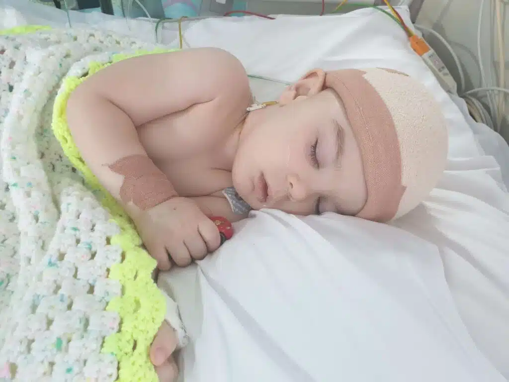 The diagnosis of medulloblastoma, a type of brain tumour was the Friday afternoon and Jacob’s surgery to remove the tumour was scheduled for the Monday. He was kept at the hospital to be monitored but on the Sunday he was so ill that he was rushed into surgery to have a brain drain inserted. The tumour had caused Hydrocephalus and Jacob was not likely to make it to the scheduled surgery. He was in surgery for four and half hours. We were not able to pick him up for a cuddle for the next week as he could not be moved due to the drain. The next day, Jacob went to theatre to have his tumour removed. He was in for 11 hours and the surgery was a success, the tumour had been removed. The problem was the cancer had already spread due to the brain fluid carrying it around the brain and spine. The next surgery was that Friday when Jacob had his central line fitted and the drain was replaced by a ventriculoperitoneal (VP) shunt. We could cuddle our boy once more.
