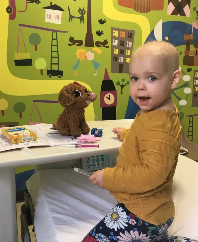 In June 2017, my daughter Sophia was diagnosed with acute lymphoblastic leukaemia (ALL) at the age of just two. Sophia was immediately admitted to John Radcliffe Hospital where she received urgent blood and platelet transfusions. Over the course of those first few days, Sophia received fluids, pain relief and chemotherapy to which she responded really well. Unfortunately, we quickly learnt that where the leukaemia was so compact in her spine it had caused a compression fracture from T8-T11 of her back which meant Sophia remained unable to walk for many months. During these initial weeks Sophia and I stayed in hospital and eventually felt Like residents! The team are amazing and we just couldn’t thank them all enough for ra their care and compassion. Finally the day came were we were discharged home and were able to enjoy the home comforts we had so missed. whe treatment protocol for ALL is long and the adjustment of being home and giving a number of medications each day was a challenge. But eventually we became experts in our daughters care and needs. Over time Sophia became more mobile, crawling at first and then slowly standing. Her ‘first steps’ are a moment I will never forget.